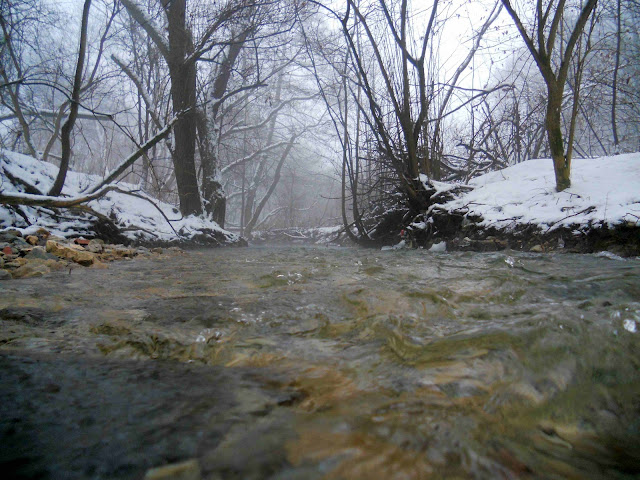 Pontosan érkeztünk a találkahelyre, a Bükkben még tél volt, mindent vastag hótakaró fedett. Ilyenkor, ha nagy a hó, eltakarja az ember nyomat, minden értelemben, nem látszik az ösvény, de a szemét sem. Nagyobb a csend, élesebbek a hangok. A színek kitűnnek a fehér háttérből. Eppusz ismét a legjobb házigazda módjára segített minket, de azért hagyta, hogy önállóan próbálkozzunk. Bálinttal felgyalogoltunk a Szinva mellett az előre megbeszélt találkozóhelyig, közben meghorgászva az ígéretesnek gondolt alámosott partoldalt, gyökereket, bedőlt fák árnyékát, gödröket, visszaforgókat. A táj zord, a víz álomszerűen tiszta volt, sok, és rendkívül gyors. Utóbbi három faktor kevéssé játszott a kezünkre. Az angol azt mondja erre, olyan tiszta, mint a gin. És ebben a pisztráng nyilván hamarabb észrevesz minket, mint mi őt.